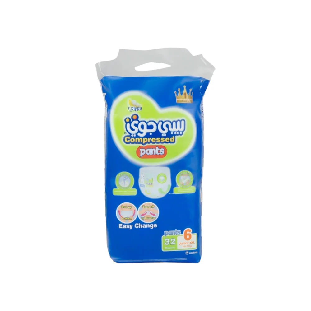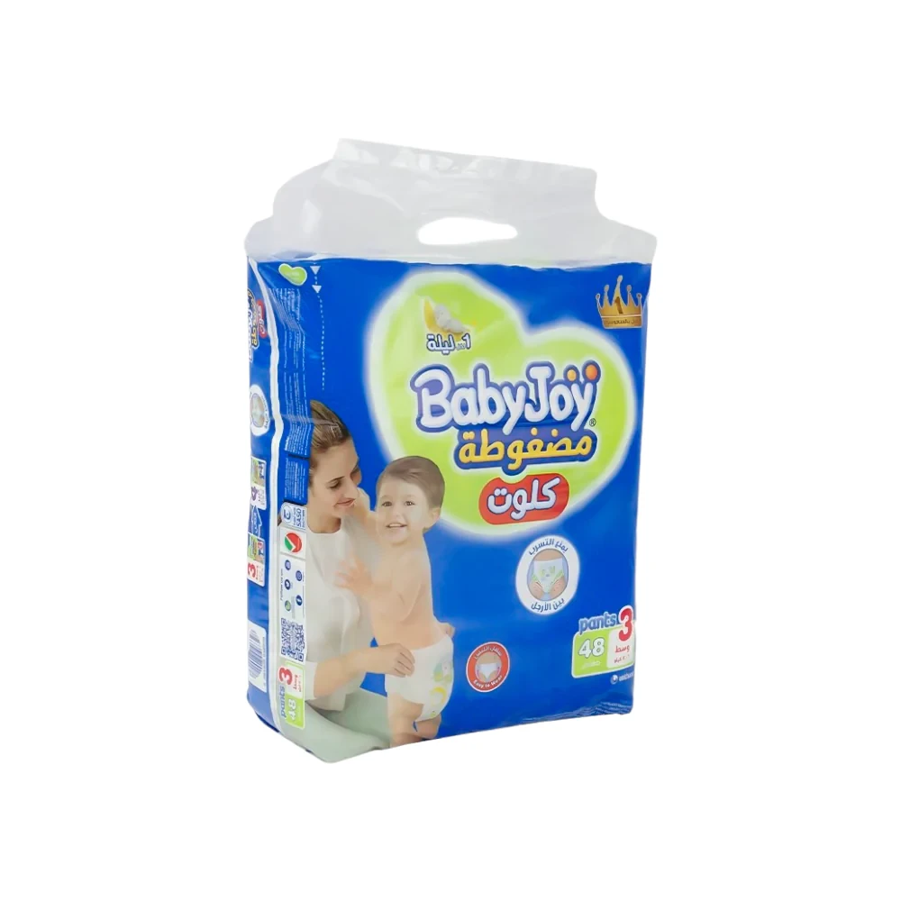 من السهل ارتداء كلوت بيبي جوي حتى لو كان طفلك يزحف أثناء تغيير الحفاض وسهل الارتداء عن طريق رفعه للأعلى وإزالته عن طريق تمزيق الجوانبمنع التسرب حول الساقين وسادات دايموند المضغوطة التي تمتص ما يصل إلى 6 أكوابالمزايا الرئيسيةسهل الارتداء عن طريق رفعه للأعلى وإزالته عن طريق تمزيق الجوانب منع التسرب حول الساقين وسادات دايموند المضغوطة التي تمتص ما يصل إلى 6 أكواب كيفية ارتداء حفاضات نمط البنطالالخطوة 1: بعد التحقق من الجانب الأمامي، ضع حفاضة بيبي جوي على طفلك كما تفعل الملابس الداخلية العادية قم بتمديد الحفاضة لإفساح مساحة كافية لساقي الطفل للذهاب من خلال الفتحتين واحدة تلو الأخرىالخطوة 2: ارفع الحفاضة حول خصر طفلك للتأكد من عدم وجود فجوات في الجزء العلوي من الساقينالخطوة 3: تأكد من أن حزام الخصر وحزام الساق غير مطوية.