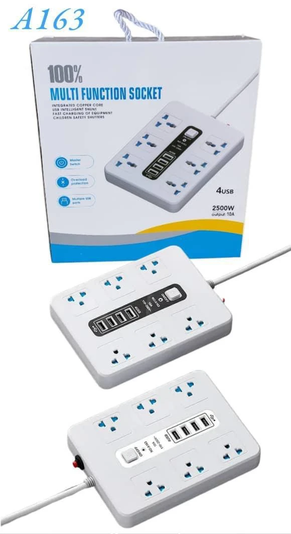 ​القوة (Output): ​2500W (واط) ​10A (أمبير) ​المنافذ (Outlets): ​عدد كبير من مقابس الطاقة (Sockets): يظهر المشترك بوضوح يحتوي على 8 مقابس متعددة الاستخدامات. ​منافذ USB: يحتوي على 4 منافذ USB للشحن. ​ميزات الحماية والأمان: ​Integrated Copper Core: (قلب نحاسي مدمج) ​Fast Charging Equipment: (معدات شحن سريع) ​Children Safety Shutters: (مصاريع أمان للأطفال) ​Master Switch: (مفتاح رئيسي للتحكم) ​Overload Protection: (حماية من الحمل الزائد) ​Multiple Use Ports: (منافذ استخدام متعدد)