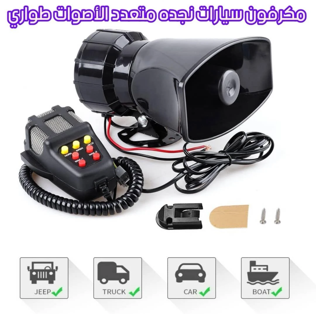 ​مكبر صوت خارجي (البوق): الجزء المسؤول عن تضخيم الصوت وإصداره. ​وحدة التحكم/الميكروفون: تحتوي على أزرار للتحكم في الأصوات المختلفة (مثل Horn, Yelp, Wail, إلخ) بالإضافة إلى ميكروفون مدمج للتحدث والنداء. ​أسلاك التوصيل: لتوصيل مكبر الصوت بوحدة التحكم وبمصدر الطاقة في السيارة (عادةً 12 فولت).