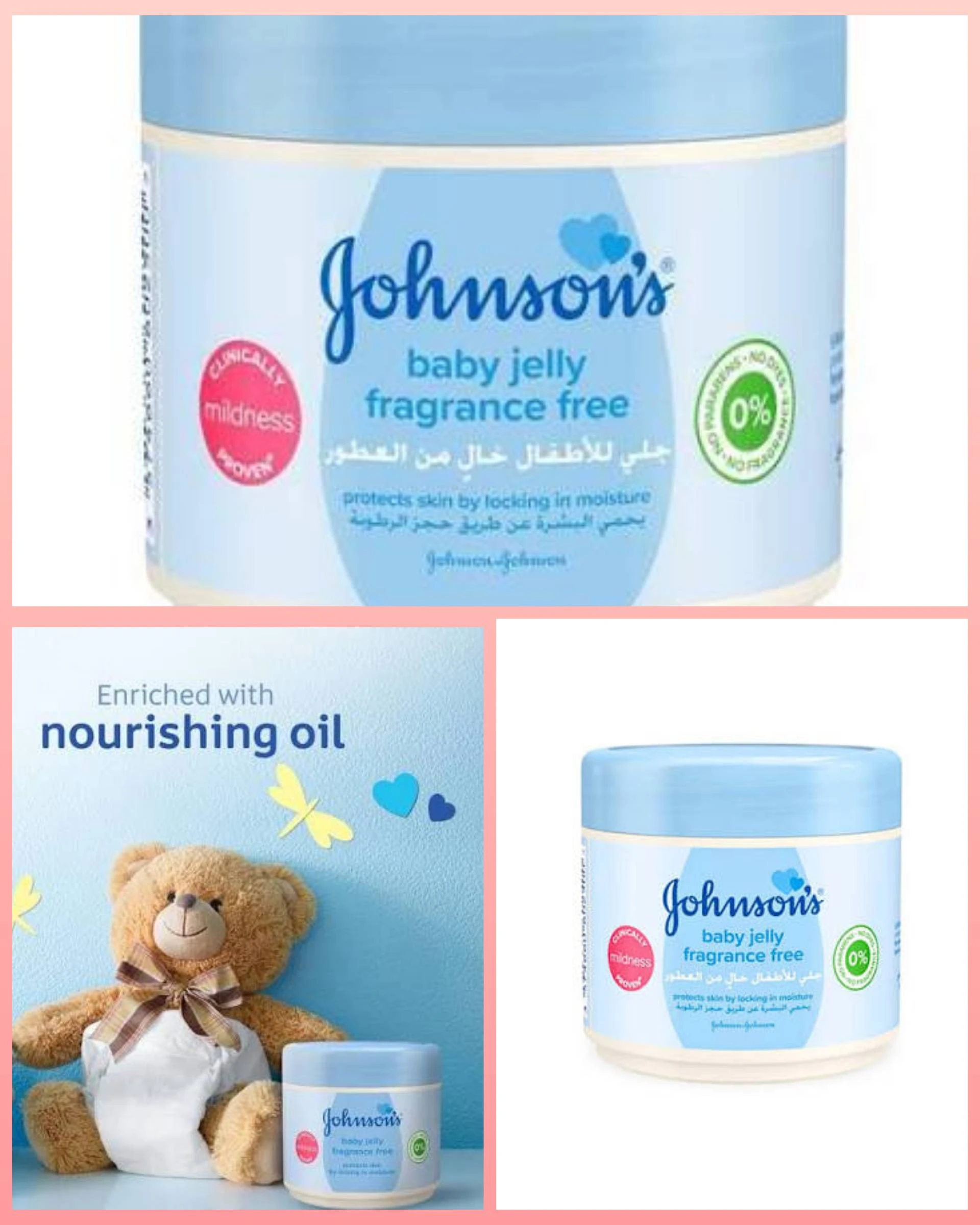 جلي الأطفال الخالي من العطور من جونسون - 250 مل. لقد تمّ تطوير جلي الأطفال الخالي من العطور من جونسون خصيصًا لحماية بشرة الطفل ومنع حدوث طفح جلدي نتيجة لاستخدام الحفاضات. لقد تم الإثبات علميًّا بأنه لطيف على البشرة كما أنه معزّز بزيت مغذّي يحفظ الرطوبة في الداخل ليترك على بشرة طفلك الرقيقة شعورًا بالنعومة. منتجات جونسون للعناية بالطفل، تثق فيه ملايين الأمهات منذ أكثر من 100 سنة. تركيبة مثبت علميًّا بأنها لطيفة تم تصميمها خصيصًا لبشرة الطفل الرقيقة. تم تطويره خصيصًا لبشرة المولود الجديد. يساعد على وضع حاجز وقائي ضدّ البلل. يحمي البشرة عن طريق حجز الرطوبة. غير مسبب للحساسية وخالٍ من الصبغات والبارابين. خالٍ من العطور. تم اختباره من قبل أطباء الأطفال وأطباء الجلد. طريقة الاستخدام: استخدمي جلي جونسون للأطفال بعد الاستحمام كمرطب للجسم. ضعيه على منطقة الحفاض بعد تغيير الحفاض للمساعدة على وضع حاجز وقائي ضدّ البلل.