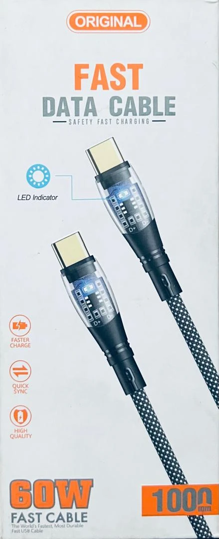 FAST DATA CABLE / 60W FAST CABLE (كابل بيانات وشحن سريع بقدرة 60 واط). ​الطاقة: يدعم الشحن السريع حتى 60W. ​الطول: 1000mm (1 متر). ​نوع الموصلات: Type-C (Type-C to Type-C).