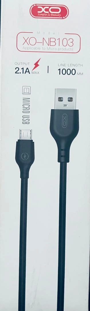 ​الطراز/الرمز: Model: XO-NB103. ​نوع الموصلات: Micro USB (في طرف الجهاز) إلى USB-A (في طرف الشاحن/الكمبيوتر). ​التيار الأقصى (Output): 2.1A MAX (يشير إلى قدرته على دعم الشحن السريع نسبيًا للأجهزة التي تعمل بهذا التيار).