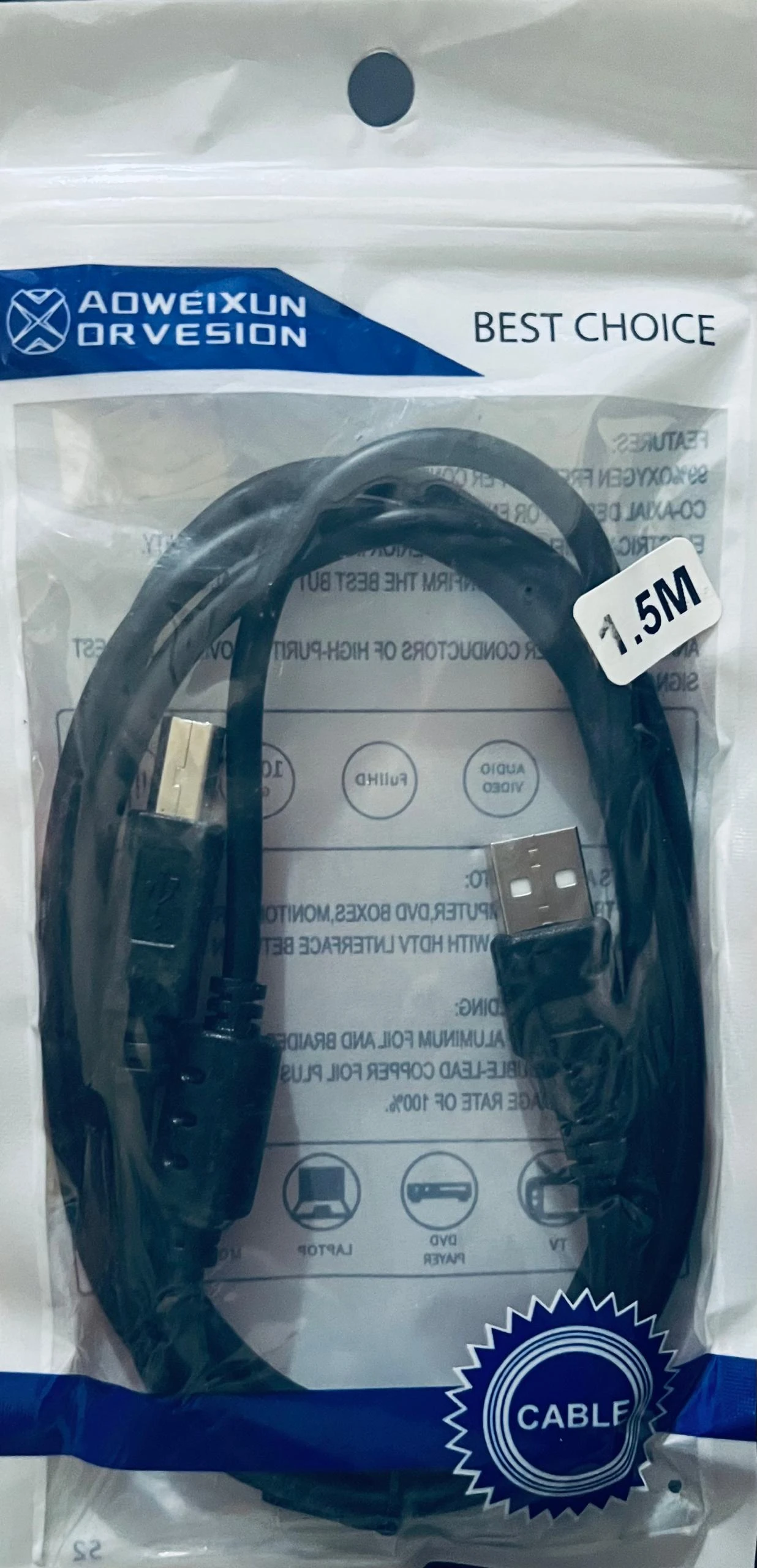 ​نوع المنتج: كابل (Cable)، كما هو موضح على الختم الأزرق في الأسفل. ​الطول: 1.5 متر (1.5M)، كما هو موضح على الملصق الأبيض الدائري. ​نوع الموصلات: ​الطرف الأول (الرئيسي): موصل USB-A القياسي (الطرف الأكبر الذي يتم توصيله بالكمبيوتر أو الشاحن). ​الطرف الثاني (الذي يظهر في الصورة): موصل Mini-USB (وهو موصل شائع استُخدم سابقًا في كاميرات الفيديو، بعض الكاميرات الرقمية، وأجهزة الألعاب المحمولة، وبعض الأقراص الصلبة الخارجية القديمة).