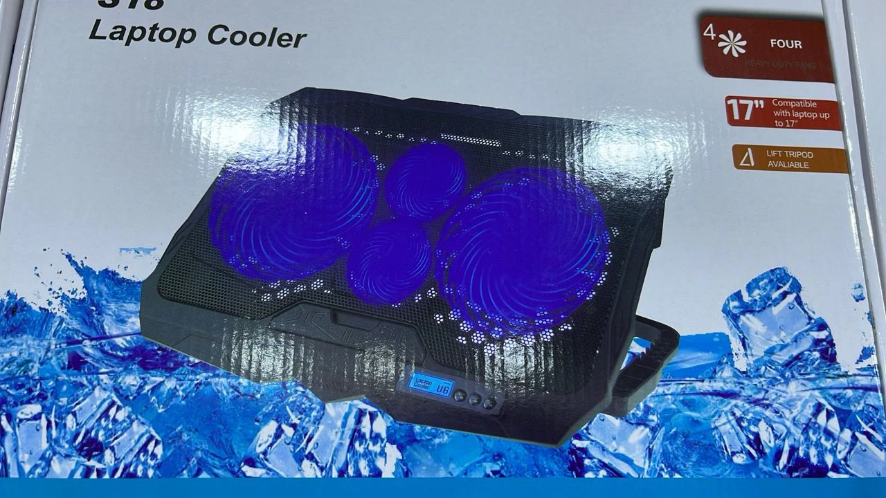 ​عدد المراوح: يحتوي على أربع (FOUR) مراوح قوية (Heavy Duty Fans). ​حجم اللابتوب المتوافق: متوافق مع أجهزة اللابتوب التي يصل حجمها إلى 17 بوصة (17"). ​الميزة الإضافية: يتوفر على حامل قابل للرفع (LIFT TRIPOD AVAILABLE)، مما يسمح بتعديل زاوية المبرد لراحة المستخدم. ​الموديل الظاهر: يظهر رقم موديل جزئي وهو S18 في أعلى يسار الصندوق. ​الشكل: المبرد أسود اللون، ويحتوي على شاشة رقمية صغيرة لعرض إعدادات السرعة أو المروحة، وتظهر المراوح مضاءة بضوء أزرق.