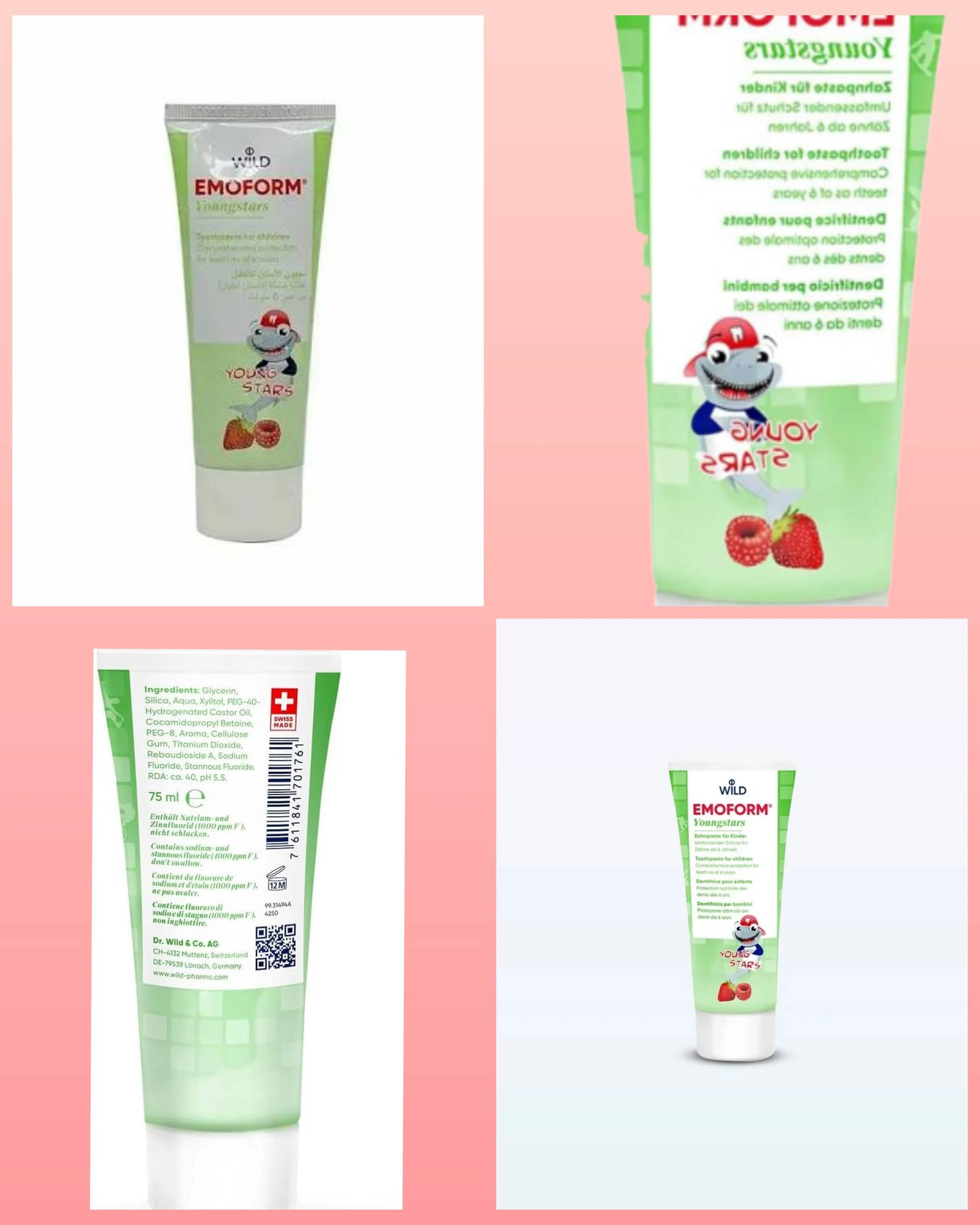 معجون الأسنان إيموفورم يونق ستارز للأطفال بحجم 75 مل.  هو منتج مصمم خصيصاً للأطفال، ويهدف إلى توفير تنظيف فعال للأسنان مع الحفاظ على سلامة الفم الحساس للأطفال. المميزات: تركيبة لطيفة: تحتوي على مكونات ناعمة تناسب الأسنان واللثة الحساسة للأطفال. طعم محبب للأطفال: غالباً ما يأتي بنكهات مميزة يحبها الأطفال، مما يساعد في تشجيعهم على تنظيف أسنانهم بانتظام. فلورايد: يحتوي على فلورايد بكميات مناسبة لحماية الأسنان من التسوس وتقويتها. مكونات آمنة: خالٍ من المواد التي قد تكون ضارة للأطفال مثل الكبريتات أو المواد الكيميائية القاسية. من المهم استخدام معجون الأسنان المناسب للأطفال لضمان أن عملية التنظيف فعالة وآمنة.  تأكد دائماً من متابعة تعليمات الاستخدام وكمية المعجون الموصى بها للأطفال حسب عمرهم. حماية شاملة للأسنان اعتبارا من عمر 6 سنوات.