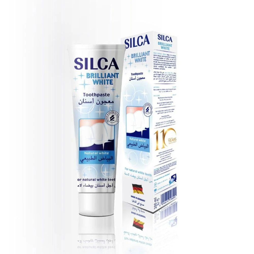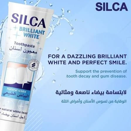 معجون أسنان "سيلكا" بنوع مخصص للتبييض يُعرف باسم "سيلكا بريليانت وايت" (Silca Brilliant White).  يتميز هذا المنتج بما يلي: إزالة البقع: يحتوي على تركيبة فعالة تساعد على إزالة البقع السطحية الناتجة عن القهوة والشاي والتدخين، وذلك بفضل وجود مادة السيليكا (Silica) كمكون كاشط ولطيف في الوقت نفسه.تبييض طبيعي: يهدف إلى استعادة البياض الطبيعي للأسنان ومنح ابتسامة أكثر إشراقًا.حماية شاملة: بالإضافة إلى التبييض، فإنه يوفر حماية من التسوس ويقوي مينا الأسنان بفضل احتوائه على الفلورايد.مناسب للاستخدام اليومي: تم تصميمه ليكون آمنًا للاستخدام اليومي دون التسبب في حساسية مفرطة للأسنان أو اللثة.  تعتبر السيليكا مكوناً أساسياً في العديد من معاجين الأسنان المبيضة لأنها تساعد على تلميع سطح السن وإزالة التصبغات دون خدش المينا بشكل كبير.