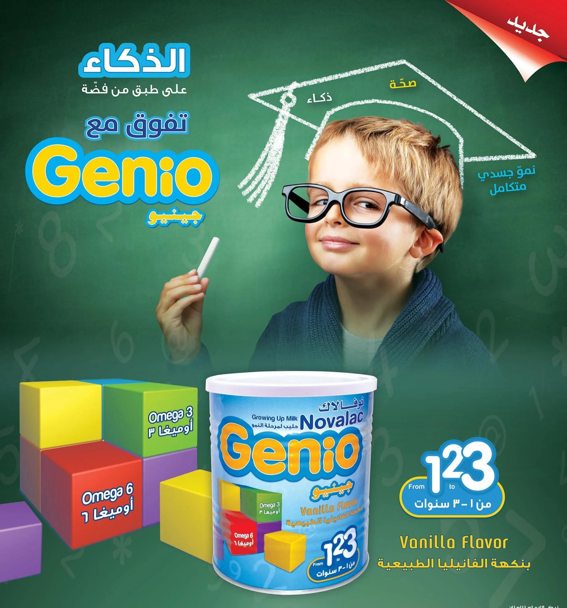 نوفالاك حليب أطفال جينيو بنكهة الفانيليا رقم  3 مناسب لدعم نمو طفلك من عمر سنة حتى عمر 3 سنوات يحتوي في تركيبته على الكالسيوم و فيتامين د   و الحديد يحتوي على كمية مناسبة من البروتينات المتوازنة خالي من السكروز و يتميز بطعم لذيذ  بنكهة الفانيلا اللذيذة غني بأوميجا 3 و اميجا 6