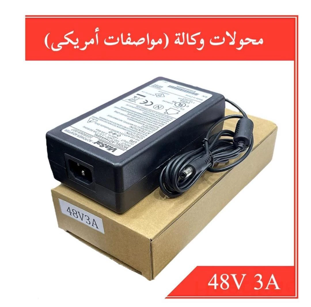 النوع (Type): محول طاقة / شاحن (Power Adapter / Charger) ​الحالة (Condition): محولات وكالة (مواصفات أمريكي) - (Agency/Original Adapters - American Specifications). This suggests it is a high-quality, possibly OEM (Original Equipment Manufacturer), and meets US electrical standards. ​خصائص المخرج (Output Specifications) ​These are clearly printed on the box and the image overlay: ​الجهد الكهربائي (Voltage): 48V (فولت) ​التيار (Current): 3A (أمبير) ​الطاقة القصوى (Maximum Power): 48\text{V} \times 3\text{A} = 144\text{W} (واط)