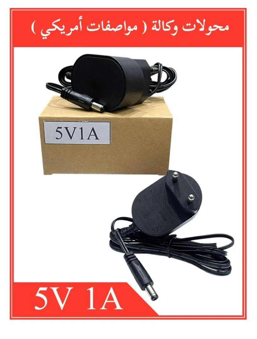 المنتج: محول (شاحن/مزود طاقة). ​الجهد والتيار الخارج (Output): ​الجهد (Voltage): 5 فولت (5V) ​التيار (Current): 1 أمبير (1A) ​نوع المحول: محول وكالة (مواصفات أمريكي) - قد يشير هذا إلى الجودة أو الموثوقية العالية.