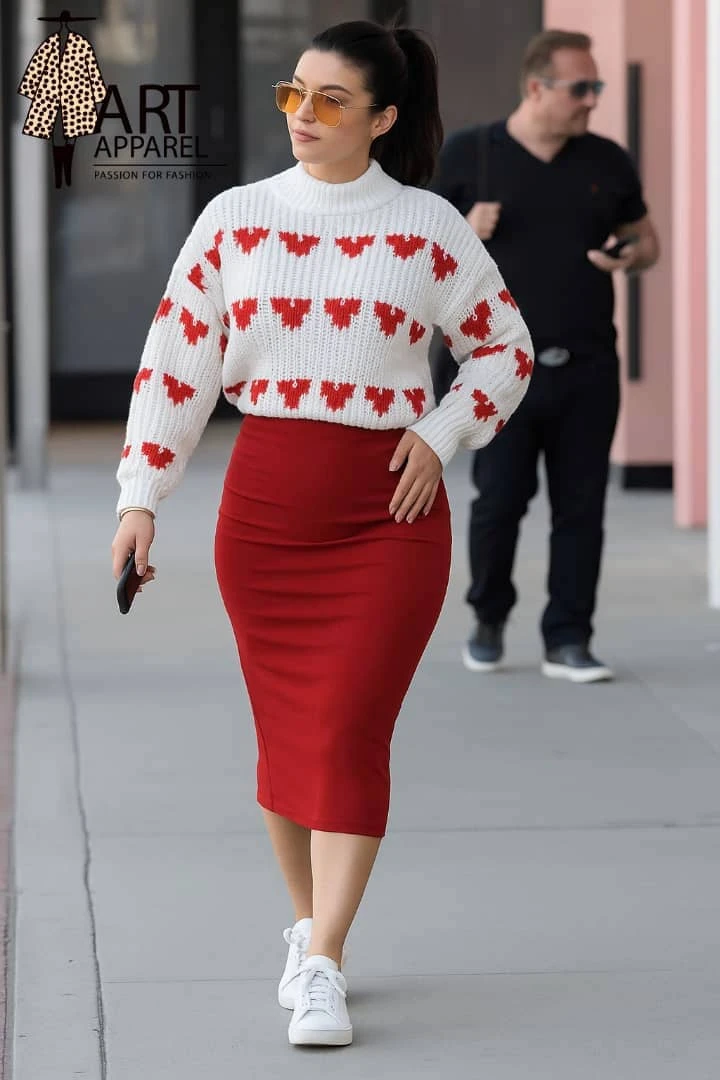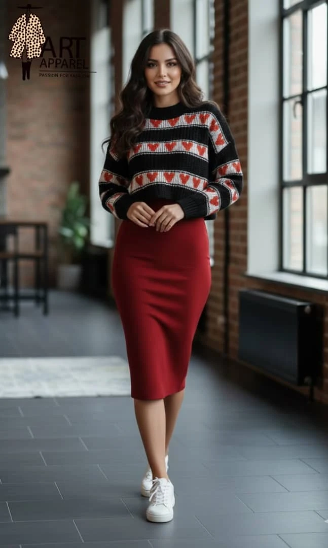 طقم أنيق يتكوّن من فستان أحمر ضيق بدون أكمام بتصميم بسيط يبرز جمال القوام، ويعلوه كنزة محبوكة قصيرة باللون الأبيض مزينة بصفوف قلوب حمراء تمنح لمسة عصرية وشبابية مع طابع رومانسي جذاب. 🧮 لونين 😍😍