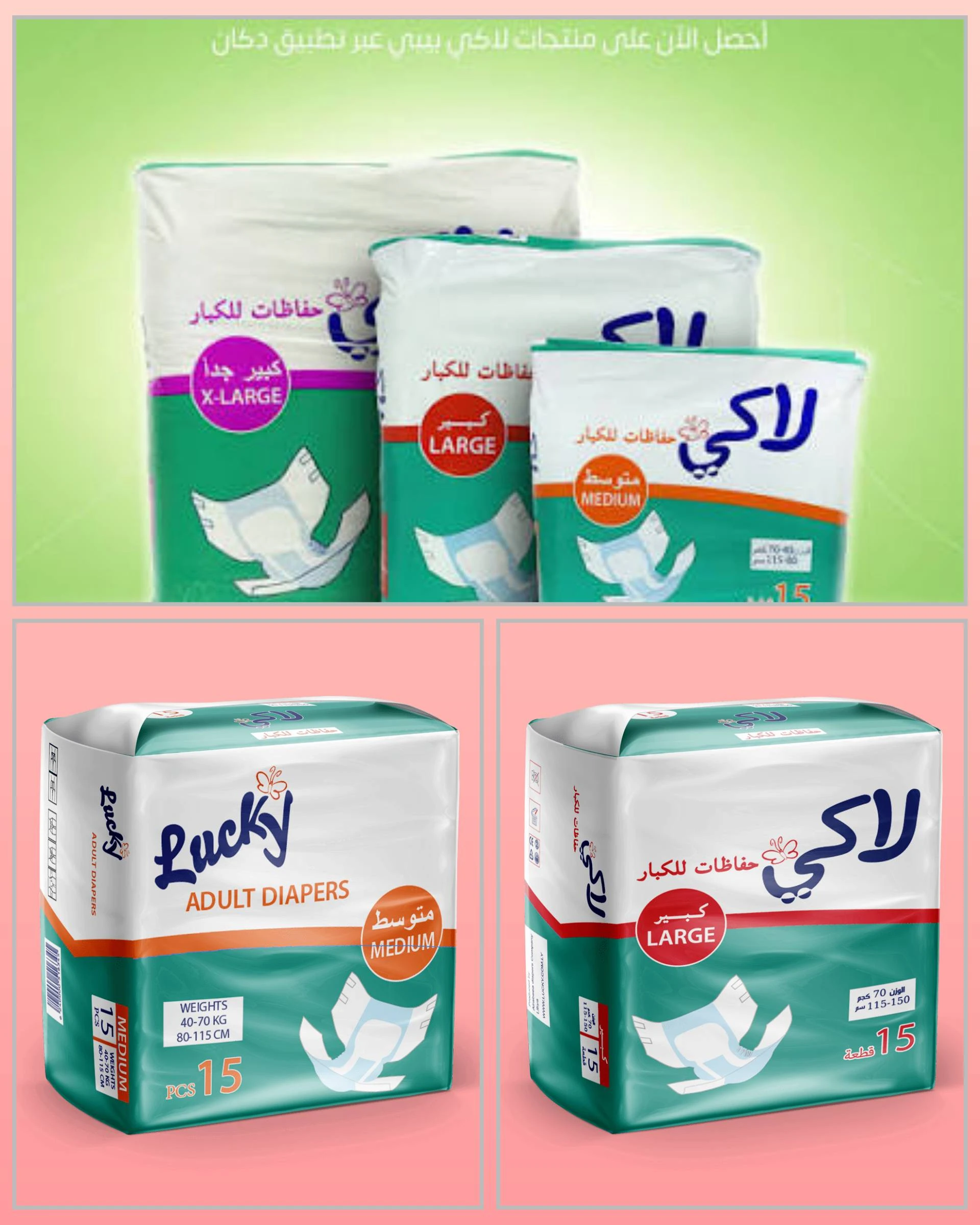 توفر حفاضات "لاكي أدلت" (Lucky Adult) الحجم Large تحتوي على 15 قطعة.