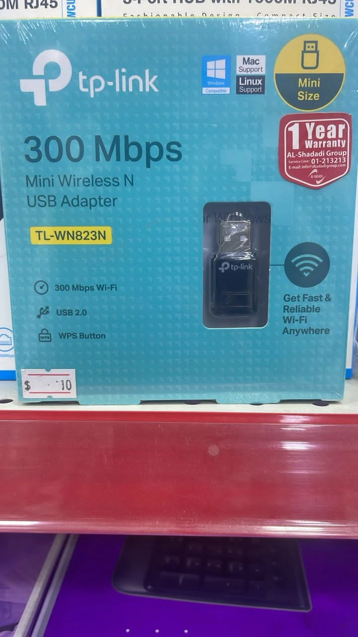 ​المنتج: محول USB لاسلكي صغير (Mini Wireless N USB Adapter). ​الطراز (Model): TL-WN823N. ​سرعة الاتصال: تصل إلى 300 ميجابت في الثانية (300 Mbps) لشبكة Wi-Fi. ​واجهة الاتصال: USB 2.0. ​زر الإعداد: يدعم خاصية WPS Button (Wi-Fi Protected Setup) لسهولة التوصيل والأمان بلمسة واحدة. ​الحجم: حجم صغير (Mini Size)، مما يجعله محمولًا وغير مزعج عند توصيله.