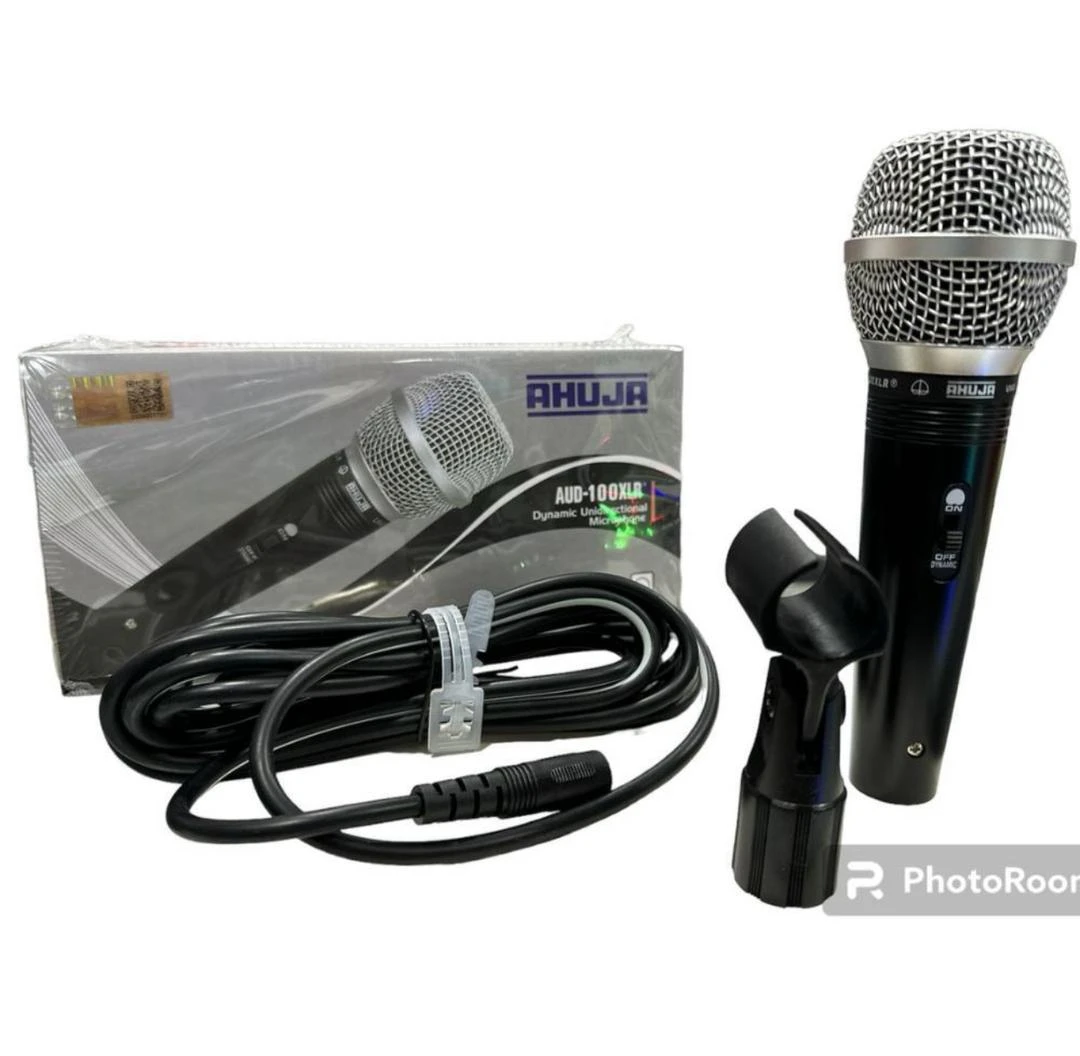 ​اسم الطراز: AUD-100XLR ​الشركة المصنعة: AHUJA (شركة معروفة بمعدات الصوت). ​النوع: ميكروفون ديناميكي (Dynamic Microphone). هذا النوع غالبًا ما يكون قويًا ومتعدد الاستخدامات ومناسبًا للأداء المباشر والخطابة والآلات الموسيقية. ​الاتصال: يشير "XLR" في اسم الطراز إلى أنه يستخدم موصل XLR، وهو المعيار الاحترافي لتوصيل الميكروفونات