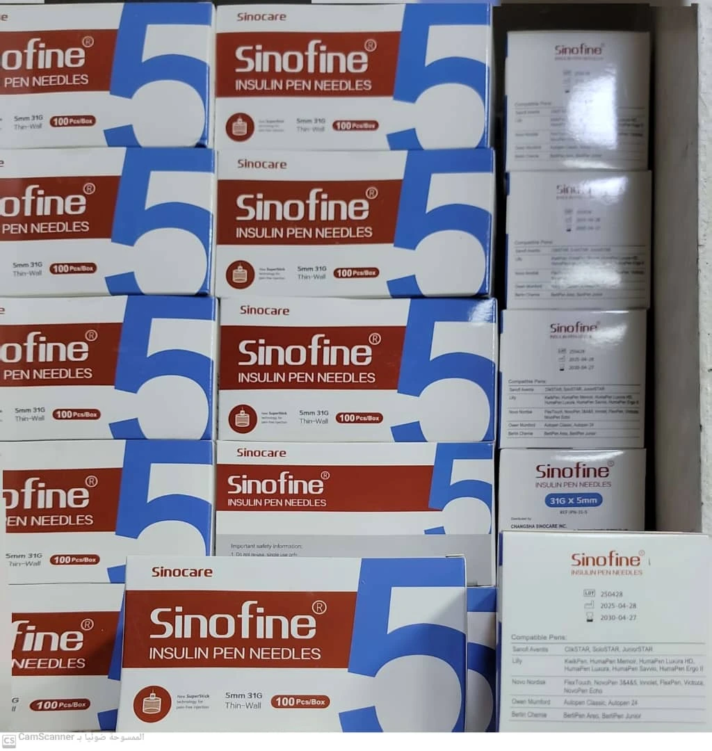 شركة سينوكير (Sinocare) تنتج إبر لانسيت (Lancets) تُستخدم مع قلم الوخز (lancing device) لقياس مستوى الجلوكوز في الدم، وليس أقلام أنسولين أو إبر أنسولين.  المنتج الذي ذكرته هو على الأرجح: لانسيت (إبر وخز) سينوكير 28G: وهي إبر معقمة تستخدم لمرة واحدة لوخز طرف الإصبع للحصول على عينة دم صغيرة لفحص السكر.عدد 28 إبرة: العبوة تحتوي على 28 إبرة (أو قد تكون عبوة أكبر مثل 50 أو 100 إبرة يتم بيعها بكميات مختلفة).  ملاحظات هامة: لانسيت تستخدم لجمع عينة الدم.إبر الأنسولين هي إبر أكبر وأطول تُستخدم لحقن الأنسولين تحت الجلد، وتكون مصممة خصيصاً لأقلام الأنسولين (مثل نوفوبين، فليكسبين وغيرها).لا تخلط بين الاثنين، فلكل منهما استخدام مختلف تماماً.  يرجى التأكد من المنتج الذي تحتاجه بالضبط، هل هو لقياس السكر أم لحقن الأنسولين.