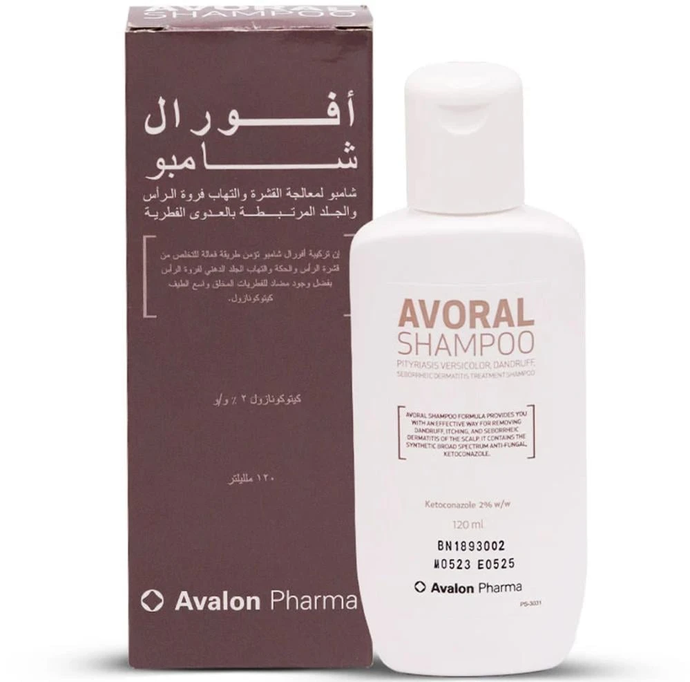 افورال شامبو لمعالجة القشرة والتهاب فروة الرأس 120 مل AVORAL لعلاج قشرة الرأس. يساعد على تخفيف تساقط الشعر والتقشير والحكة المرتبطة بالقشرة. الكيتوكونازول فهو مضاد للفطريات يعمل على منع نمو الفطريات. أفالون أفورال لعلاج حالة الجلد المعروفة باسم النخالية (السعفة المبرقشة)، العدوى الفطرية التي تسبب تفتيح أو تغميق الجلد على الرقبة أو الصدر أو الذراعين أو الساقين. يستخدم طبيا لعلاج : الالتهابات الفطرية الجهازية التالية لدى المرضى الذين فشلوا أو الذين لا يتحملون العلاجات الأخرى : داء الفطار البرعمي،داء الكروانيات،داء النوسجات،الفطار الصباغي،وداء الفطريات. كيفية الاستخدام : اتبع تعلينات الاستعمال في النشرة المرفقة داخل العبوة .اترك الشامبو على الشعر لمدة 3 إلى 5 دقائق قبل شطفه بالماء. التحذيرات: للاستخدام الخارجي فقط.تجنب ملامسة المنتج للعينين.يحفظ بعيدا عن متناول الأطفال.يحفظ في مكان بارد وجاف.