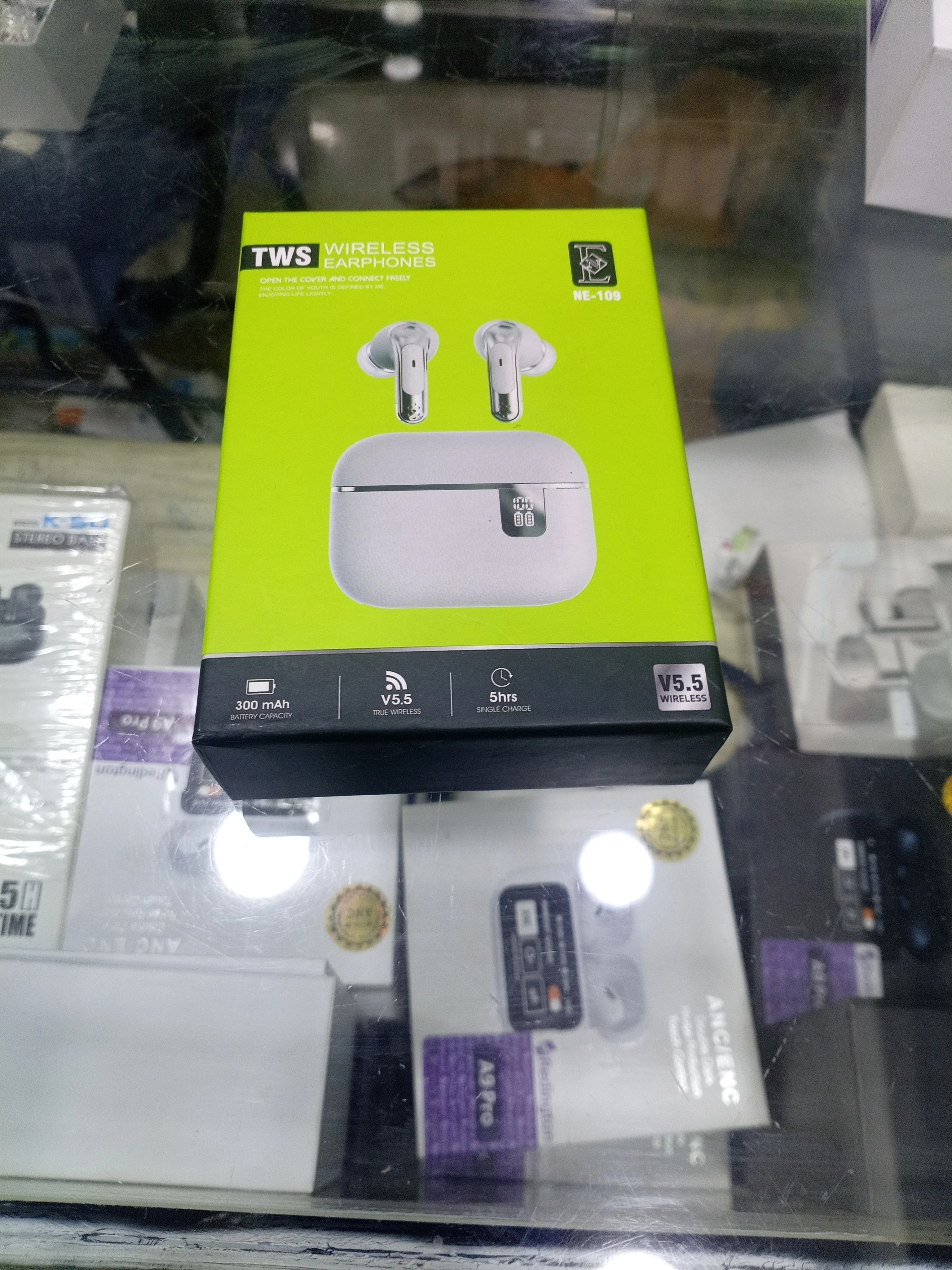 ​اسم الموديل: NE-106 ​سعة البطارية (العلبة/الشاحن): 300\ \text{mAh} (مللي أمبير في الساعة) ​إصدار البلوتوث اللاسلكي: V5.5 ​وقت التشغيل/الاستخدام: 5\ \text{hrs} (5 ساعات)