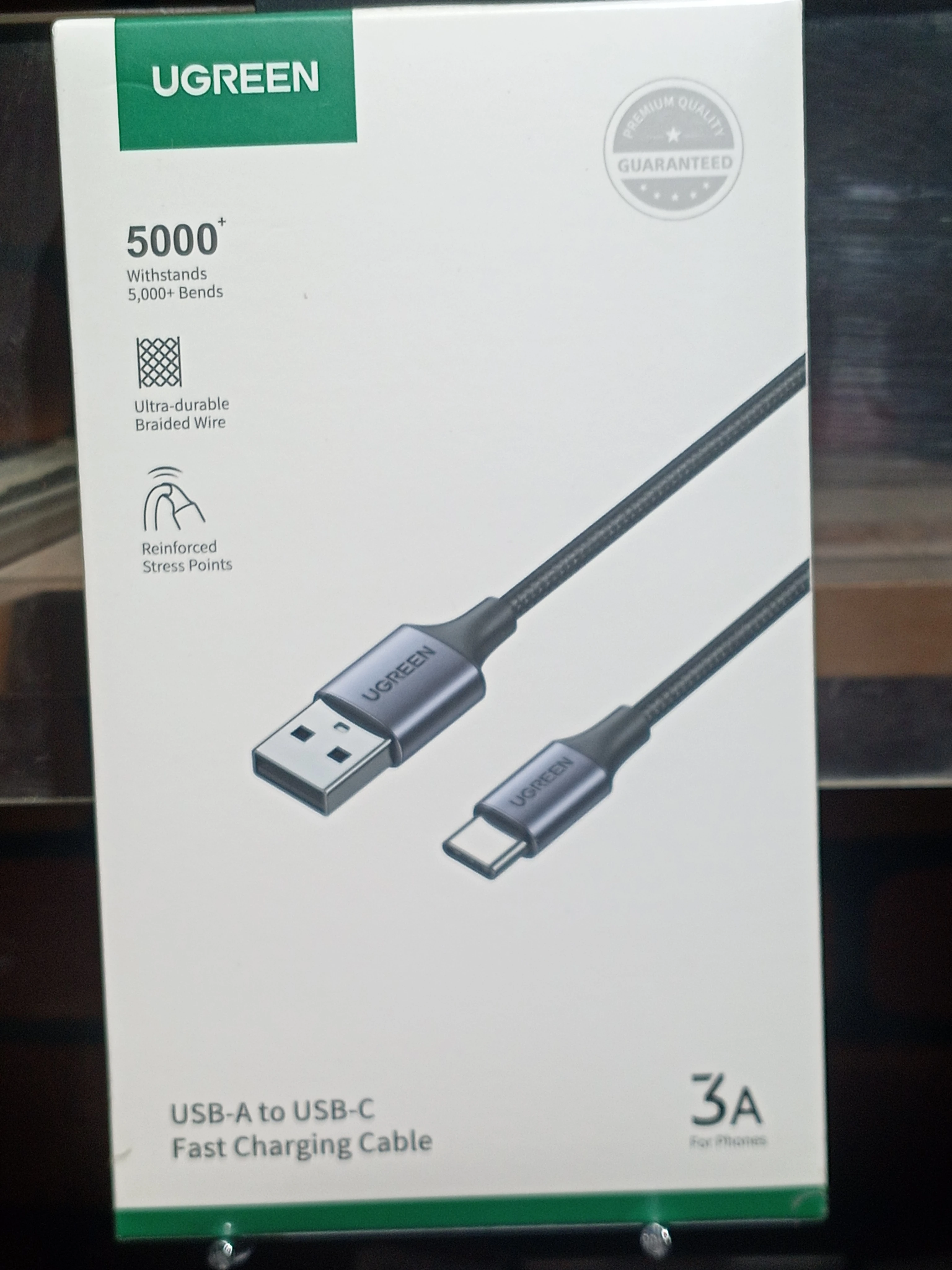 ​نوع المنتج: USB-A to USB-C Fast Charging Cable (كابل شحن سريع من USB-A إلى USB-C). ​لون الكابل: يظهر الكابل باللون الأسود/الرمادي الداكن، وهو مغطى بنسيج مضفر (Braided) لزيادة المتانة. ​قدرة الشحن (التيار): مُشار إليها برمز 3\text{A} (3 أمبير). ​التوافق: يُذكر أنه "For Phones" (للهواتف)، وهو كابل قياسي لأجهزة الأندرويد والأجهزة الأخرى التي تستخدم منفذ USB-C.