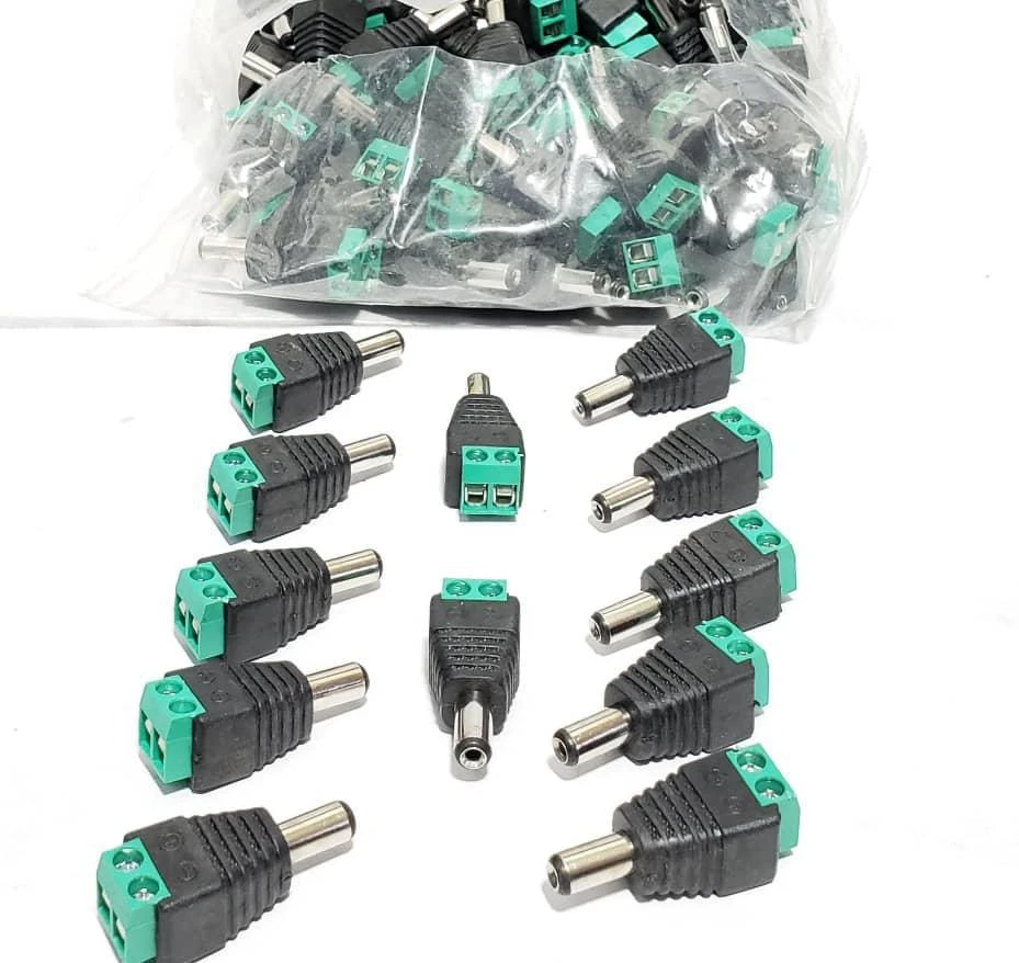 ​القابس (Plug) الذكر (Male): وهو الطرف الذي يتم إدخاله في مقبس طاقة أنثوي (Female Jack). (القطع الأكثر شيوعًا في الصورة). ​المقبس (Jack) الأنثوي (Female): وهو الطرف الذي يتم إدخاله فيه قابس طاقة ذكر (Male Plug). (القطعتان في منتصف الصورة تقريباً). ​حجم قابس/مقبس DC (الأبعاد القياسية): ​القطر الخارجي (Outer Diameter): 5.5 ملم (5.5mm). ​القطر الداخلي (Inner Diameter - حجم الدبوس المركزي): 2.1 ملم (2.1mm) هو الأكثر شيوعاً. قد يكون 2.5 ملم في بعض الحالات النادرة، لكن 2.1 ملم هو المعيار لتطبيقات الطاقة منخفضة الجهد هذه.