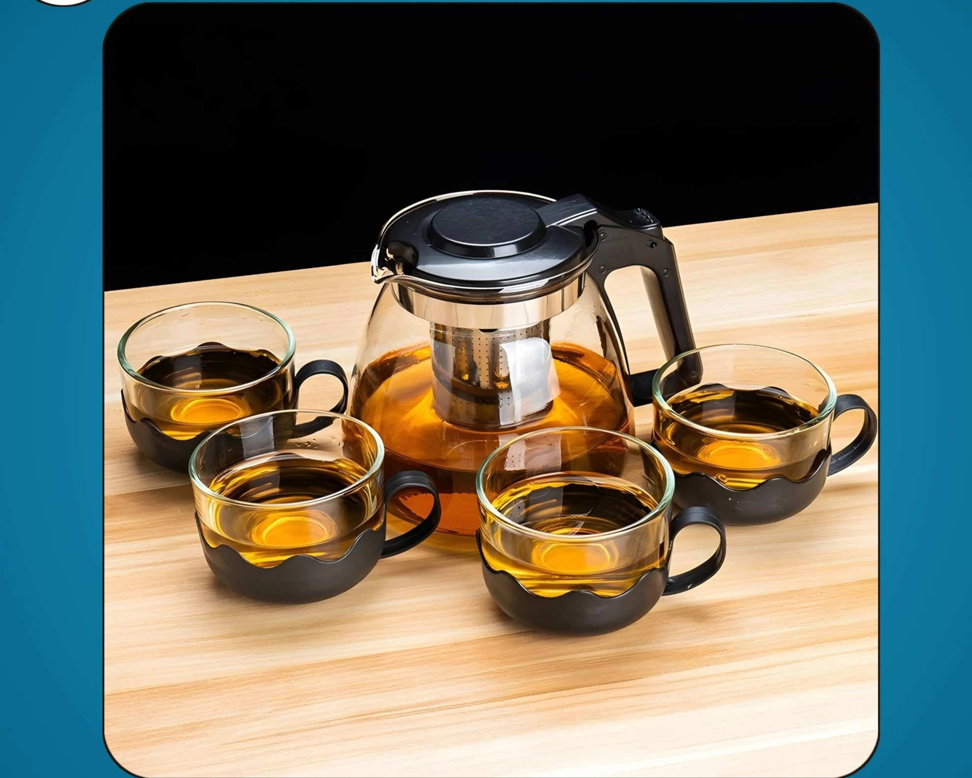 كتللي حراري زجاجي مع كاسات - مصنوع من زجاج مقاوم للحرارة - شكل أنيق وجذاب - يحتوي على كاسات زجاجية للشاي أو القهوة - مناسب لتقديم المشروبات الساخنة
