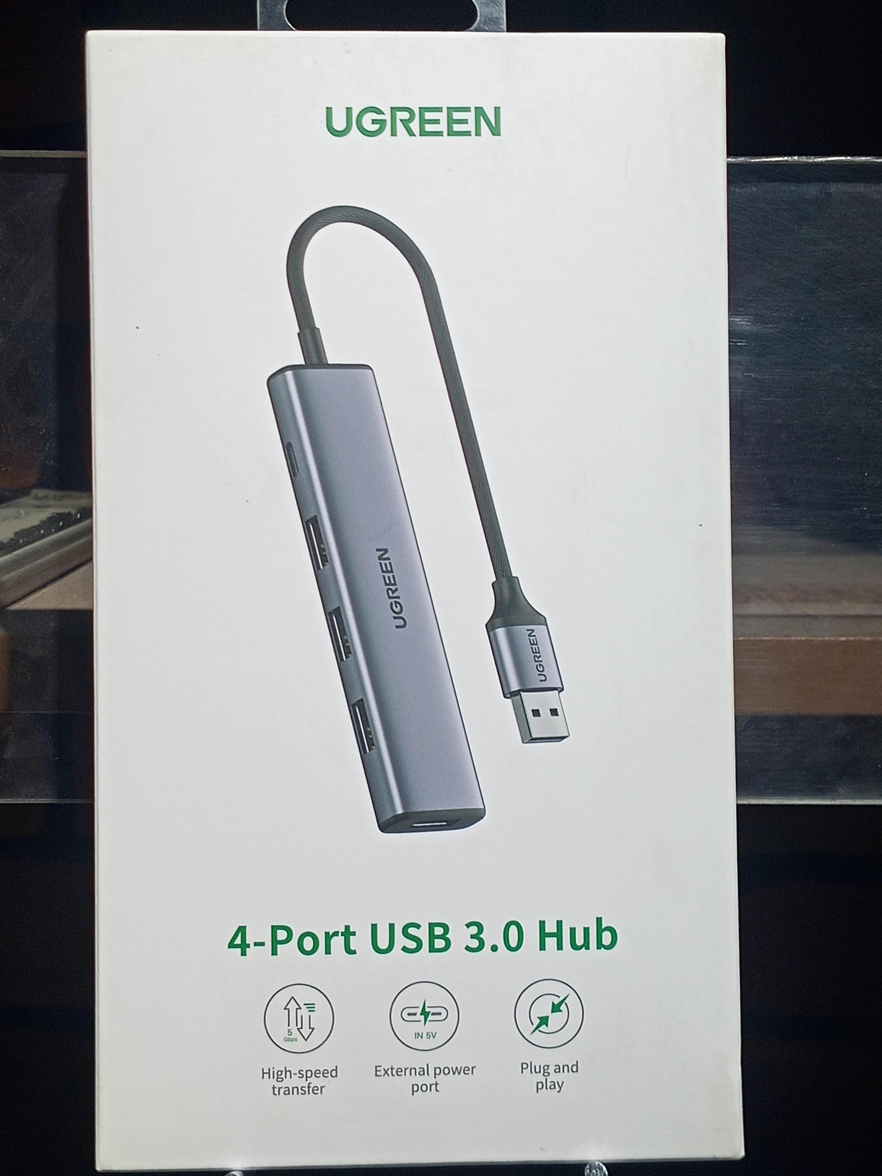نوع المنتج: 4-Port USB 3.0 Hub (موزع 4 منافذ USB 3.0). ​الشكل: جهاز مدمج بلون رمادي داكن، متصل بكابل قصير ينتهي بوصلة USB-A (النوع القياسي).