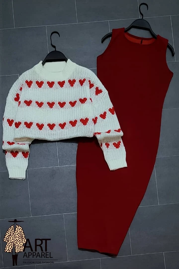 طقم أنيق يتكوّن من فستان أحمر ضيق بدون أكمام بتصميم بسيط يبرز جمال القوام، ويعلوه كنزة محبوكة قصيرة باللون الأبيض مزينة بصفوف قلوب حمراء تمنح لمسة عصرية وشبابية مع طابع رومانسي جذاب. 🧮 لونين 😍😍