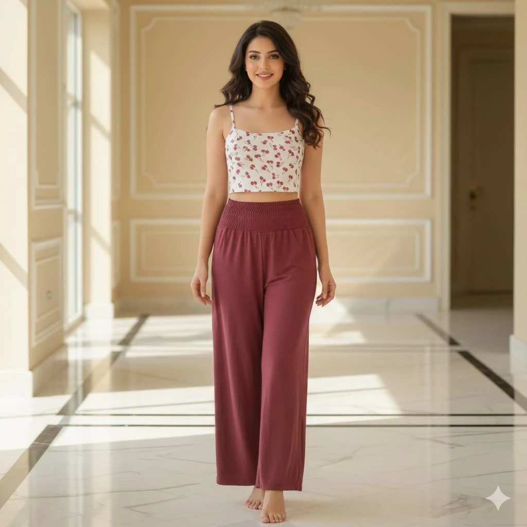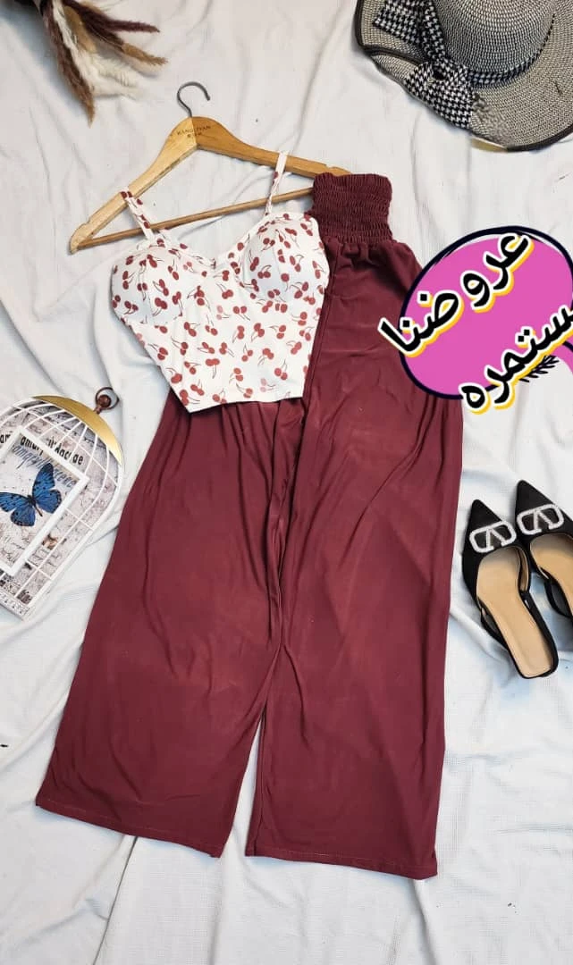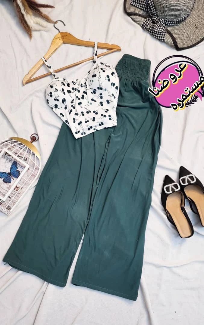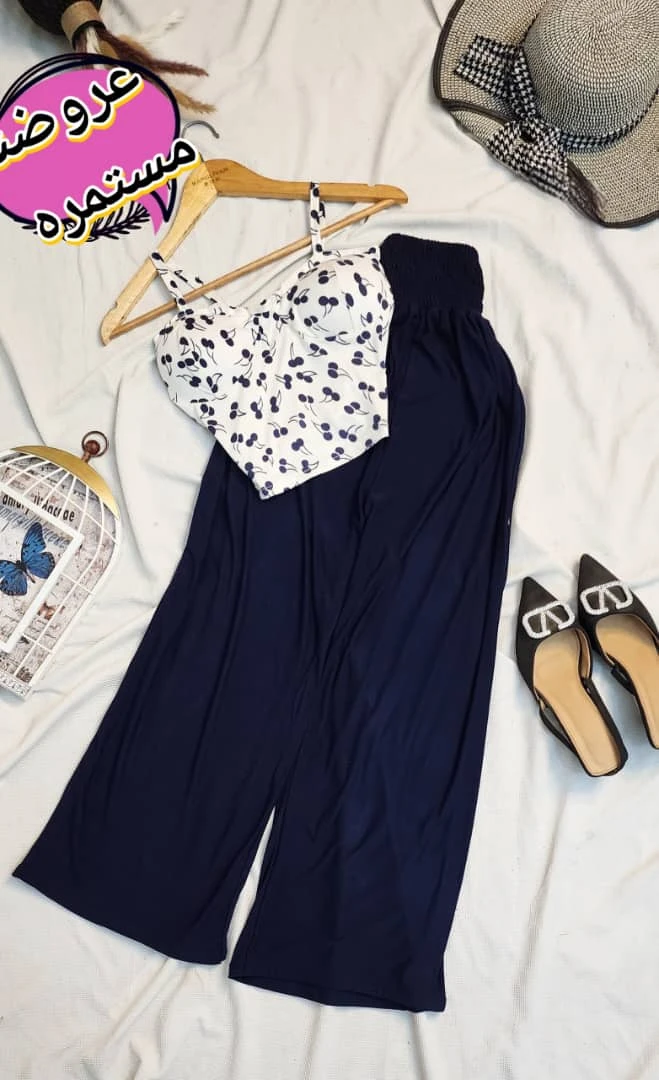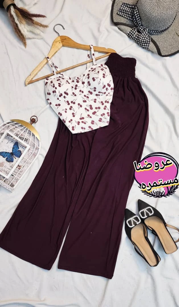 طقم نسائي قطعتين بلوزه علاقي وبنطلون بخصر هاي ويست مطاط فتحه فرنسي واسعه. المقاسات فري سايز يلبس من وزن 35الى وزن65